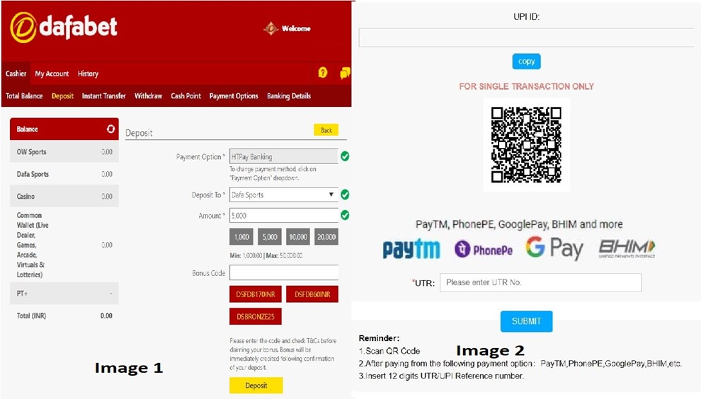 Deposit Money in Dafabet in India – Secure & Hassle-Free (2025 Guide) Last Updated: August 3, 2022 Looking for an easy and hassle-free way to deposit money in Dafabet in India? Look no further, you'll find all you need here! In this article, we'll share everything you need to know about how to deposit money on this bookie, list the various Dafabet deposit methods, as well as look into the maximum and minimum deposit on Dafabet. MOST IMPORTANT INFORMATION How to deposit money on Dafabet Dafabet minimum deposit Dafabet deposit slip Quick links How to Deposit Money in Dafabet? Dafabet Deposit Methods in India Problems with Depositing Money in Dafabet Non-Recommended Dafabet Deposit Methods CricketBettingAdvice Final Say How to Deposit Money in Dafabet? (Source: Dafabet) With its comprehensive sportsbook and numerous betting markets, Dafabet has stamped its authority in the world of online betting, quickly going on to become one of India’s best cricket betting sites. You can choose from a wide selection of betting payment methods, including credit and debit cards, e-wallets, and even bank transfers. More importantly, Dafabet is one of India’s top low-deposit betting sites. The Dafabet minimum deposit is only ₹1000 with local bank transfer and ₹500 with UPI, Express Banking, and e-wallets, and the majority of these deposits are processed quickly and without any processing fees. Unsure of how to deposit on Dafabet? Here’s a step-by-step flow chart: Step 1: Sign in to your Dafabet account and navigate to the ‘Cashier' section. Step 2: Click ‘Deposit' and choose a preferred deposit method from the available options. Step 3: Enter the amount you wish to deposit. Step 4: Follow the instructions and confirm your deposit. MAKE YOUR ACCOUNT TODAY VISIT SITE Dafabet Deposit Methods in India If you're worried about how to deposit money in Dafabet in India, fortunately, the bookmaker supports a mix of betting payment methods. More importantly, the minimum deposit on Dafabet is ₹500. In the table below, you will find all the various Dafabet deposit methods along with the minimum deposit for each. Dafabet Deposit MethodsMinimum DepositMaximum DepositProcessing TimeProcessing Fee Local Bank Transfer₹1000₹3000002 to 4 hoursNA Express Banking₹500₹100000InstantNA HTPay Banking₹1000₹50000InstantNA Paykassma PTM₹500₹500000InstantNA UPI Pay₹500₹50000010 minutesNA DD Pay UPI₹1000₹50000InstantNA DS Pay UPI₹1000₹50000InstantNA Pay5 UPI₹1000₹50000InstantNA NETELLER₹500₹3075000InstantNA Skrill₹500₹1500000InstantNA Skrill Quick Check-out₹1000₹720000InstantNA Payz₹300₹30000InstantNA Astro Pay₹1000₹50000InstantNA Visa/ Mastercard₹675₹67500InstantNA Cryptocurrencies₹300 to ₹1500₹50000 to ₹7200000Usually instant to 1 hourNA How to Deposit on Dafabet with UPI? With UPI, you can send money promptly and at no charge, directly from your bank account. Needless to say, UPI is massively popular in India, and it is, therefore, no surprise that UPI is also one of the most useful and practical Dafabet deposit methods. To deposit money in Dafabet with UPI: Step 1: Log into your Dafabet account & click on the ‘Cashier' tab. Step 2: Open the deposit menu, and select UPI Pay, DD Pay UPI, DS Pay UPI, or Pay5 UPI from the ‘Indian Bank Transfer’ and ‘Local Bank Transfer’ sections. Step 3: Now, a new screen will open, where you can select the Dafabet deposit method you wish to use, its sportsbook, and how much you want to deposit. Click on ‘Deposit'. Step 4: Another screen will pop up with a QR code, which you need to scan using a UPI mobile application, enter the transaction or UTR ID, and click on ‘Submit'. How to Deposit on Dafabet with Bank Transfer? The local bank transfer option is similar to UPI, except that you don’t need to download a UPI application. With this payment method, you can deposit money in Dafabet in India as long as you have your bank account-related information ready. It is quick, easy, and costs nothing at all. To deposit money in Dafabet with local bank transfer: Step 1: Log into your Dafabet account, click on the ‘Cashier’ tab. Step 2: Open the deposit menu and select ‘Local Bank Transfer’. Step 3: Choose your bank to complete the Dafabet deposit. Make sure you have your online banking details handy, so you can log in when prompted. Step 4: Enter the amount you wish to deposit, choose the date of transaction, enter the transaction ID/reference ID/UTR No., attach the deposit slip, and click on ‘Submit’. And that's it, you have successfully deposited money in your Dafabet account. However, please note that before you can complete the transaction, you must verify your PAN card. For that, attach the same to the Dafabet website, select a Dafabet bank account, and click on ‘Submit’. They will send their complete bank details via email or SMS, as per your choice. How to Deposit on Dafabet with Visa/Mastercard? If you want to know how to deposit money in Dafabet in India with Visa and Mastercard, there’s just one pre-condition you must know — that is, you must have a Skrill account as the Visa and Mastercard deposits on Dafabet are powered by Skrill. To deposit money in Dafabet with Visa and Mastercard: Step 1: Log into your Dafabet account and click on the ‘Cashier’ tab. Step 2: Open the deposit menu and select ‘Visa, Mastercard or Diner’s Club’ from the e-wallets section. Step 3: Choose your sportsbook and enter the amount you wish to deposit. Step 3: Click on ‘Deposit’. A new window to log into your Skrill account will open. Step 4: Log in and deposit using this payment method as long as the same is added to your Skrill wallet. How to Deposit on Dafabet with Express Banking? Another widely-used transfer method in India is Express Banking. It functions similar to UPI, so if you have a smartphone, you can use it. When depositing money in Dafabet with Express Banking, you would merely need to