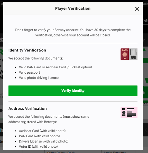 Betway Verification: How To Verify Betway Account in India (2025) Last Updated: March 14, 2023 Betway does not accept players from India anymore With a laser-sharp focus on the Indian audience and a highly beginner-friendly design, Betway consistently ranks among the country's best cricket betting sites in India. If you're unsure of how to verify Betway account, this guide will take you through the entire Betway verification process so you can withdraw any winnings you may have without hassle. MOST IMPORTANT INFORMATION How to verify your Betway account Documents that are accepted Betway account verification on mobile Quick links Why Is Betway Account Verification Important? Betway Verification: Getting Started Betway Verification on Mobile Betway Account Verification FAQs CricketBettingAdvice Final Say Why Is Betway Account Verification Important? Verifying your betting account is compulsory across India's leading sportsbooks and online casino sites if you want to withdraw your money. Sure, certain bookies may allow you to withdraw up to a limit without you having to verify your account, but that's a rarity. Comprehensive verification processes ensure no illegal activity occurs. The Betway verification process, also called KYC, is simple and straightforward. KYC procedures are a regulatory requirement that must be met in order for bookies like Betway to maintain their licences. These licences are important to Indian punters as it shows them that the betting sites they choose are safe, tested, and secure. The KYC procedure is a way for bookies to make sure that players are who they say they are, and that they are not engaging in any illegal financial practices like money laundering. Betway Verification: Getting Started Before you can even consider completing a KYC procedure, you’ll need to sign up to Betway first. This is super easy; simply head to the Betway website and fill in some very basic details like your name and email. Alternatively, you can use the Betway fast-track registration if you have a valid Aadhaar ID. (Source: Betway) How To Verify Your Betway Account There are a couple of ways to start the verification process. Firstly, upon Betway registration, you’ll receive a pop-up notification on your betting site screen. Simply click on it to begin the Betway verification process. (Source: Betway) Alternatively, you can choose any banking option and you’ll be directed to verify your account – you can do this by clicking on your username in the top right of the screen. You may need to do this if the pop-up notification doesn’t appear for some reason. (Source: Betway) Betway has made verification a very clear and simple process. Immediately upon accessing the verification screen, Betway will inform you of the required documentation and time limit. Your Betway account must be verified within 30 days or else your account will be closed. The following forms of ID are accepted: PAN Card Aadhaar Card Passport Photo driving licence After verifying your identity, you’ll also be required to supply some proof of address. This is quite easy as most of the above documentation will work just fine. You can use the following documents, along with a valid photo, for proof of address: PAN Card Aadhaar Card Driver’s licence Voter ID Alternative documents such as utility bills, bank statements, and tax bills. These documents cannot be older than 6 months. (Source: Betway) The provided documents must be clear, high-quality copies and only JPG and PNG images are accepted. Simply upload a document for each type of verification by selecting it from your computer or mobile device and press submit to complete the action. Your Betway account verification should not take longer than 24 to 48 hours. However, in some cases, additional documentation may be required, and uploading poor-quality copies will further delay this process. Once verified, you can enjoy limitless deposits and lightning-fast Betway withdrawals. Betway Verification on Mobile You don’t even need to be at home to verify your account with Betway. Make sure you have the required documentation stored on your phone already and you can simply use the Betway mobile app while on the go. The process is exactly the same – click on the same notification at the top of the mobile app and you’ll be brought to the same player verification screen. Documentation can either be uploaded from your mobile storage or you can take photos of the required documentation right there and then using your phone's camera. Since the Betway mobile platform is one of the best cricket betting apps in India, we’d recommend verifying your account this way. It’s fast, easy and the Betway verification can be completed with a single finger! Betway Account Verification FAQs What does Betway verification mean? Verification is a necessary process to stamp out illegal activity and protect punters. For the punter, this just means uploading some identifying documents that prove you intend to use the betting site for legitimate purposes. What do I need for Betway verification? You will need some identifying documents to verify your Betway account. These will need to be uploaded via a simple process on the Betway website or mobile app. Just make sure you upload high-quality copies to avoid any delays. Can I withdraw funds without verifying my account? No, you cannot withdraw funds without verifying your account. Thankfully, it only takes between 24 – 48 hours to verify your account. After that, you’ll be free to withdraw funds so long as you meet the minimum or maximum limitations. Do I need to verify for every Betway withdrawal? Not at all. It is only a requirement to pass the Betway verification ahead of your very first withdrawal. That being said, any suspicious behaviour may warrant further documentation just to ensure you are engaging in safe betting practices. Is it safe to send my documents to Betway? It certainly is. Betway is a licensed betting site